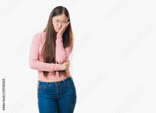 Young Chinese woman over isolated background wearing glasses thinking looking tired and bored with depression problems with crossed arms.
