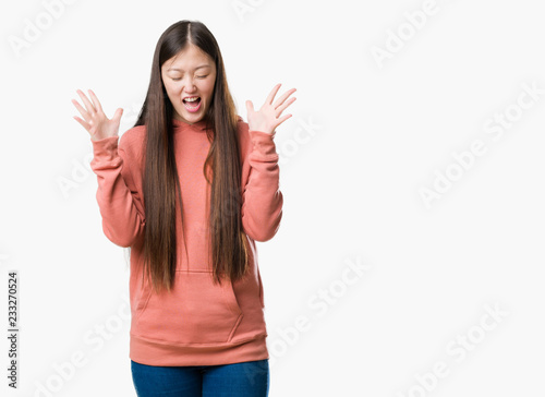 Young Chinese woman over isolated background wearing sport sweathshirt celebrating mad and crazy for success with arms raised and closed eyes screaming excited. Winner concept