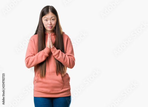 Young Chinese woman over isolated background wearing sport sweathshirt praying with hands together asking for forgiveness smiling confident.
