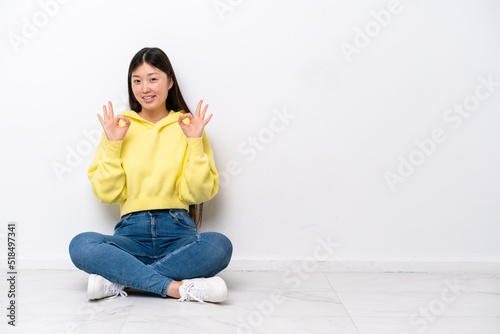 Young Chinese woman sitting on the floor isolated on white wall showing an ok sign with fingers