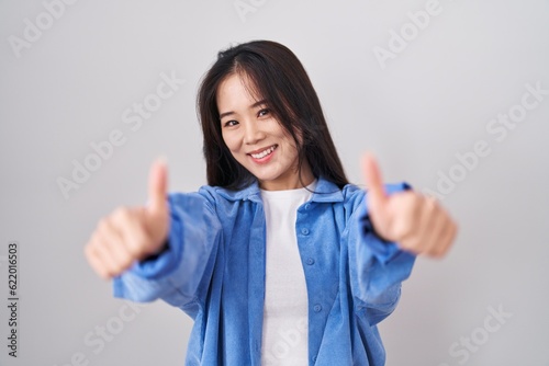 Young chinese woman standing over white background approving doing positive gesture with hand, thumbs up smiling and happy for success. winner gesture.