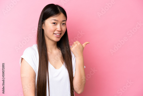 Young Chinese woman wearing a band aids isolated on pink background pointing to the side to present a product