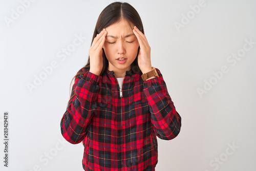 Young chinese woman wearing casual jacket standing over isolated white background with hand on headache because stress. Suffering migraine.