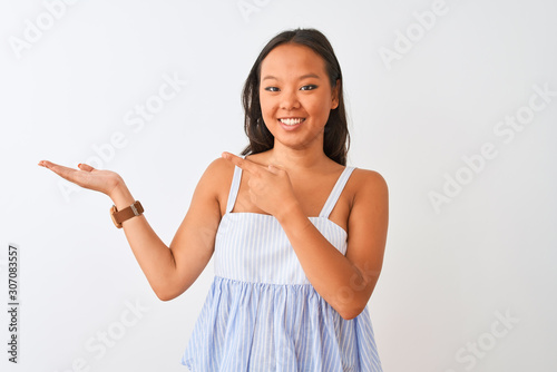 Young chinese woman wearing casual striped dress standing over isolated white background amazed and smiling to the camera while presenting with hand and pointing with finger.