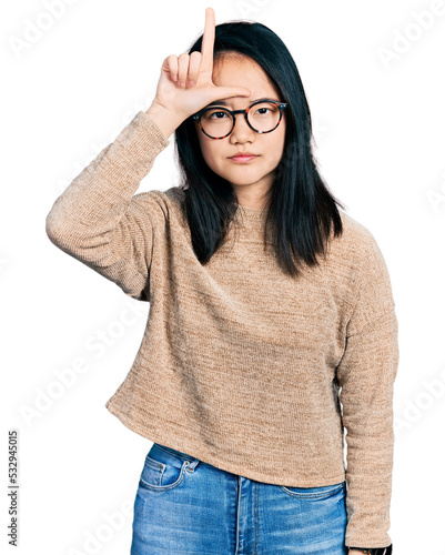 Young chinese woman wearing casual sweater and glasses making fun of people with fingers on forehead doing loser gesture mocking and insulting.