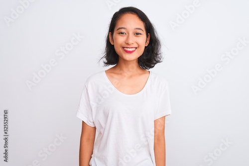 Young chinese woman wearing casual t-shirt standing over isolated white background with a happy and cool smile on face. Lucky person.