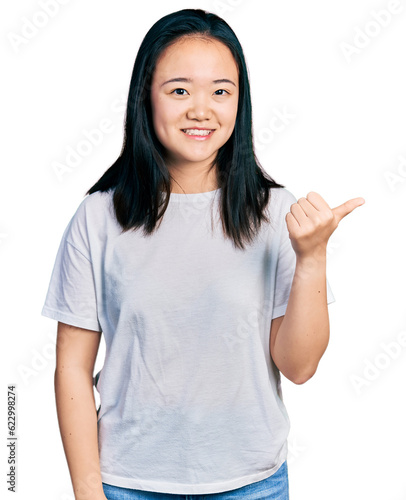 Young chinese woman wearing casual white t shirt smiling with happy face looking and pointing to the side with thumb up.