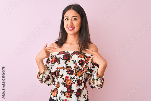 Young chinese woman wearing floral t-shirt standing over isolated pink background looking confident with smile on face, pointing oneself with fingers proud and happy.