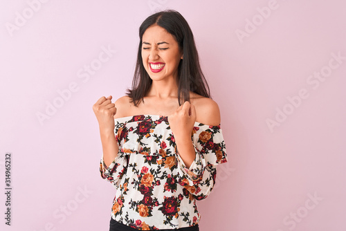 Young chinese woman wearing floral t-shirt standing over isolated pink background very happy and excited doing winner gesture with arms raised, smiling and screaming for success. Celebration concept.