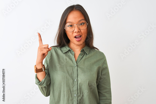 Young chinese woman wearing green shirt and glasses over isolated white background pointing finger up with successful idea. Exited and happy. Number one.