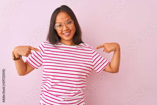Young chinese woman wearing striped t-shirt and glasses over isolated pink background looking confident with smile on face, pointing oneself with fingers proud and happy.