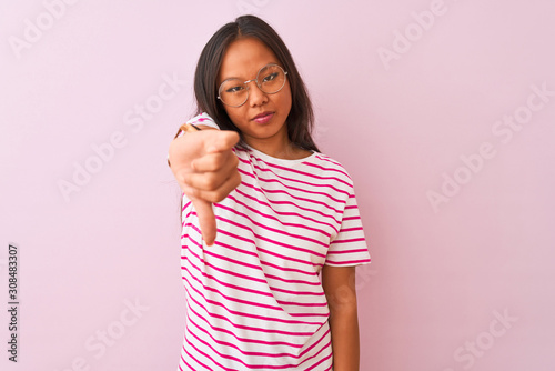 Young chinese woman wearing striped t-shirt and glasses over isolated pink background looking unhappy and angry showing rejection and negative with thumbs down gesture. Bad expression.