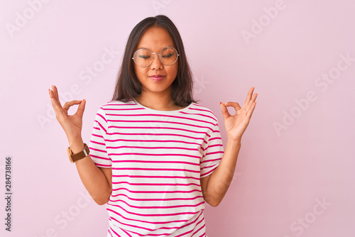 Young chinese woman wearing striped t-shirt and glasses over isolated pink background relax and smiling with eyes closed doing meditation gesture with fingers. Yoga concept.