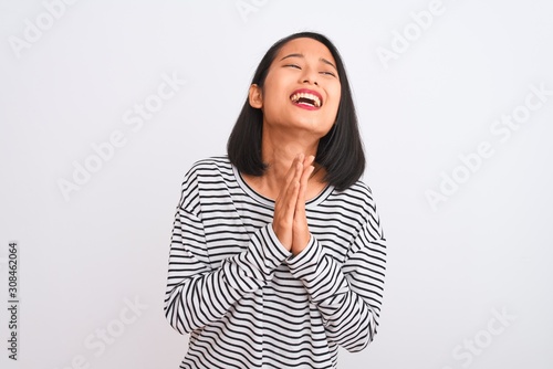 Young chinese woman wearing striped t-shirt standing over isolated white background begging and praying with hands together with hope expression on face very emotional and worried. Asking