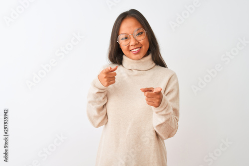 Young chinese woman wearing turtleneck sweater and glasses over isolated white background pointing fingers to camera with happy and funny face. Good energy and vibes.