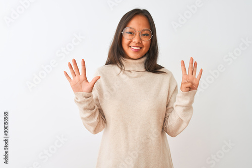 Young chinese woman wearing turtleneck sweater and glasses over isolated white background showing and pointing up with fingers number nine while smiling confident and happy.