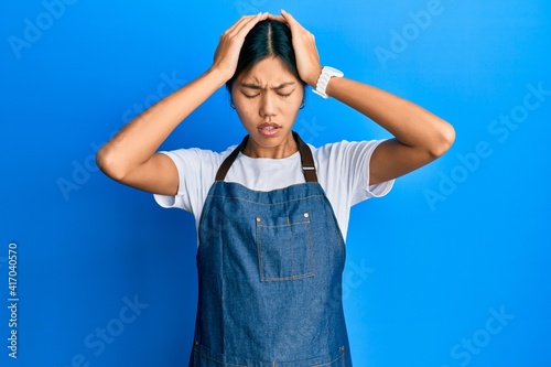 Young chinese woman wearing waiter apron suffering from headache desperate and stressed because pain and migraine. hands on head.