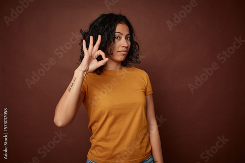 Young colombian curly hair woman isolated on brown background winks an eye and holds an okay gesture with hand.