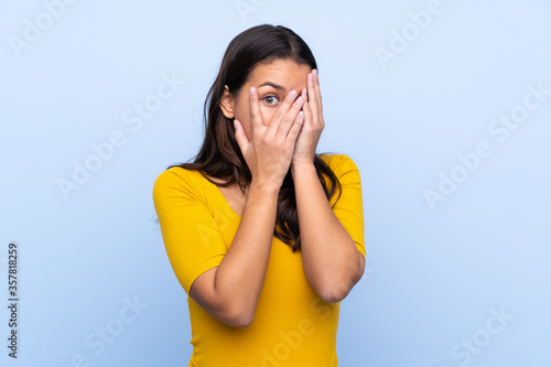 Young Colombian girl over isolated blue background covering eyes and looking through fingers