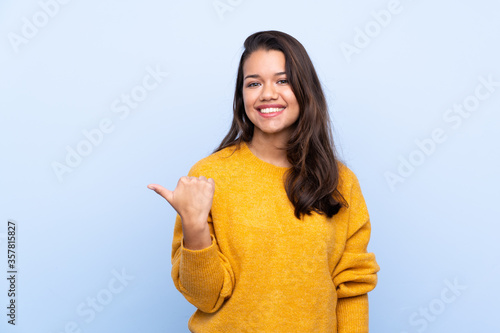 Young Colombian girl with sweater over isolated blue background pointing to the side to present a product