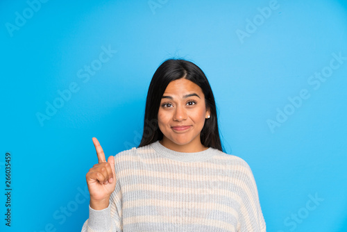Young Colombian girl with sweater pointing with the index finger a great idea