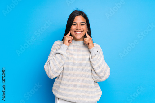 Young Colombian girl with sweater smiling with a happy and pleasant expression