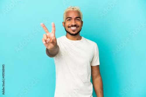 Young Colombian handsome man isolated on blue background smiling and showing victory sign