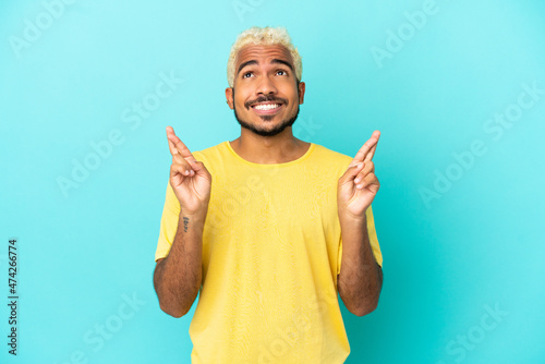 Young Colombian handsome man isolated on blue background with fingers crossing and wishing the best