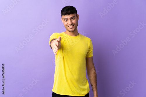 Young Colombian man isolated on purple background shaking hands for closing a good deal