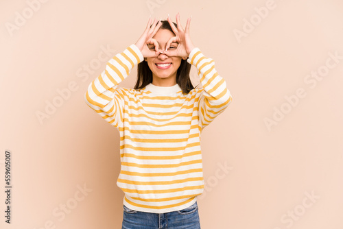 Young colombian woman isolated on beige background showing okay sign over eyes
