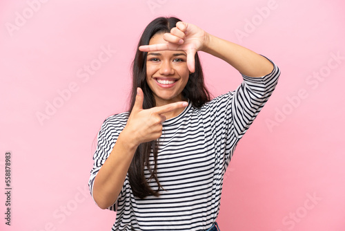 Young Colombian woman isolated on pink background focusing face. Framing symbol