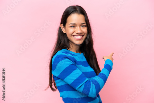 Young Colombian woman isolated on pink background pointing back