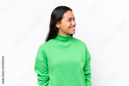 Young Colombian woman isolated on white background looking to the side and smiling