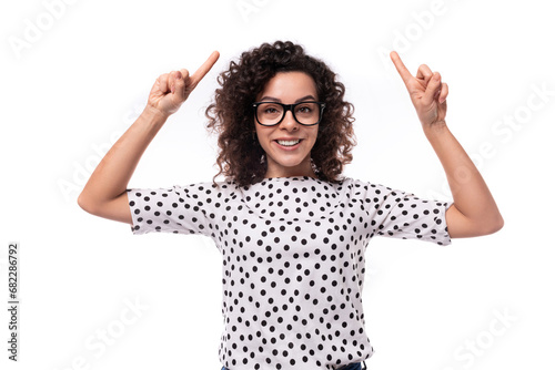 young confident curly secretary woman with glasses is dressed in a blouse with mug print