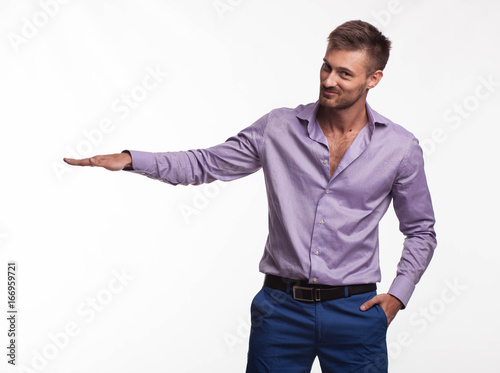Young confident man portrait of a confident businessman showing by hands on a gray background. Ideal for banners, registration forms, presentation, landings, presenting concept.