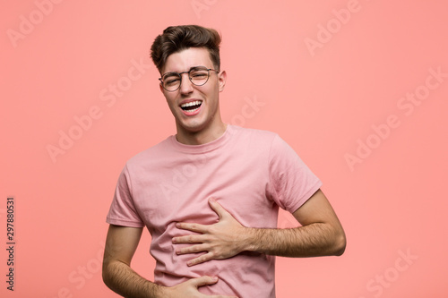 Young cool caucasian man laughs happily and has fun keeping hands on stomach.