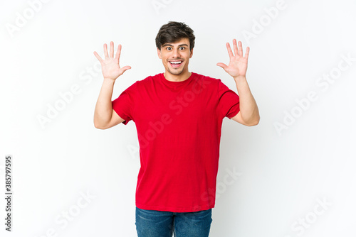Young cool man receiving a pleasant surprise, excited and raising hands.