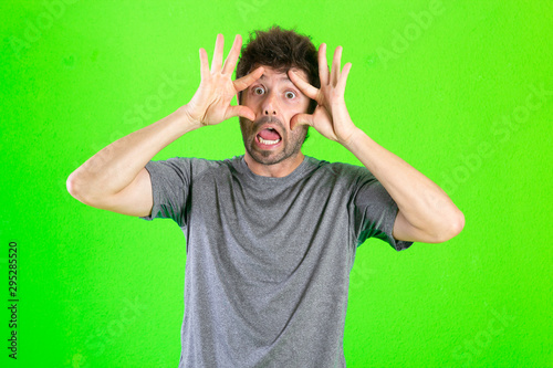 Young crazy man feeling excited, happy, surprised or shocked, astonished at something unbelievable over green background