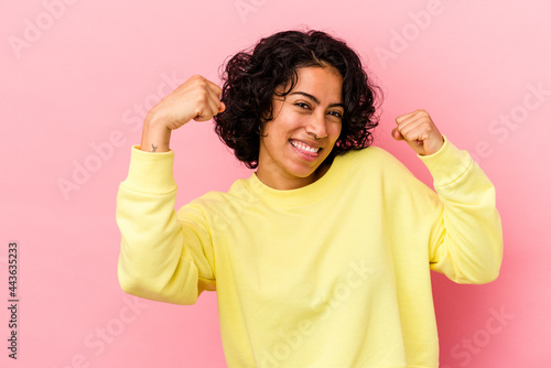 Young curly latin woman isolated on pink background raising fist after a victory, winner concept.