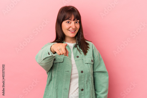 Young curvy caucasian woman isolated on pink background pointing to front with fingers.