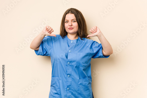 Young curvy nurse woman feels proud and self confident, example to follow.