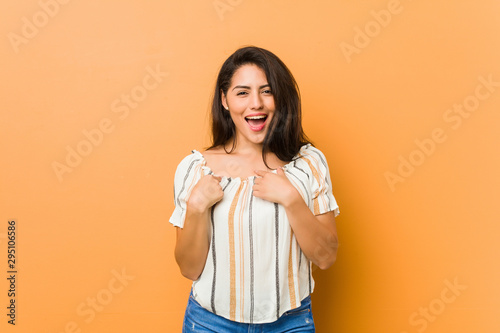 Young curvy woman surprised pointing with finger, smiling broadly.