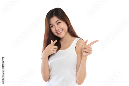 Young cute asian woman smiling and making pointing gesture isolated on white background