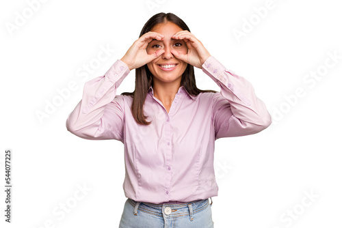 Young cute caucasian woman isolated showing okay sign over eyes