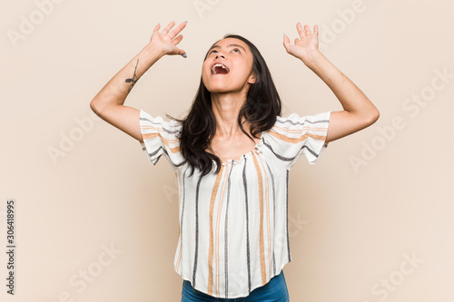 Young cute chinese teenager Young blonde woman wearing a coat against a pink background screaming to the sky, looking up, frustrated.