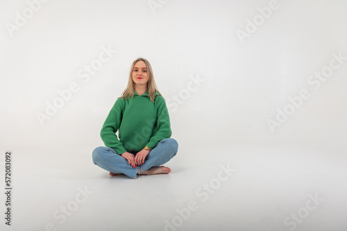 Young, cute, emotional, chic girl sitting on the floor in a flirtatious mood, hand gestures, empty space, wearing jeans and a green sweater on an isolated white background, place for text