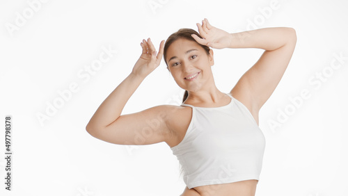 Young dark-haired Caucasian plus size woman in white top raises her hands up to her head smiling wide for the camera on white background | Depilation concept