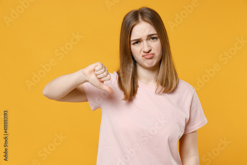 Young disappointed displeased dissatisfied sad caucasian woman 20s wearing casual basic pastel pink t-shirt showing thumb down dislike gesture isolated on yellow color background studio portrait.