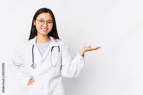 Young doctor chinese woman isolated showing a copy space on a palm and holding another hand on waist.