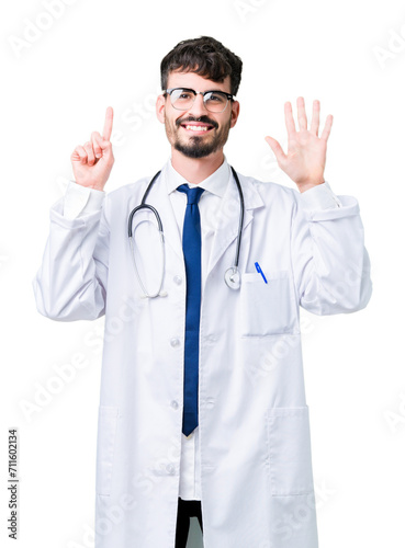 Young doctor man wearing hospital coat over isolated background showing and pointing up with fingers number six while smiling confident and happy.